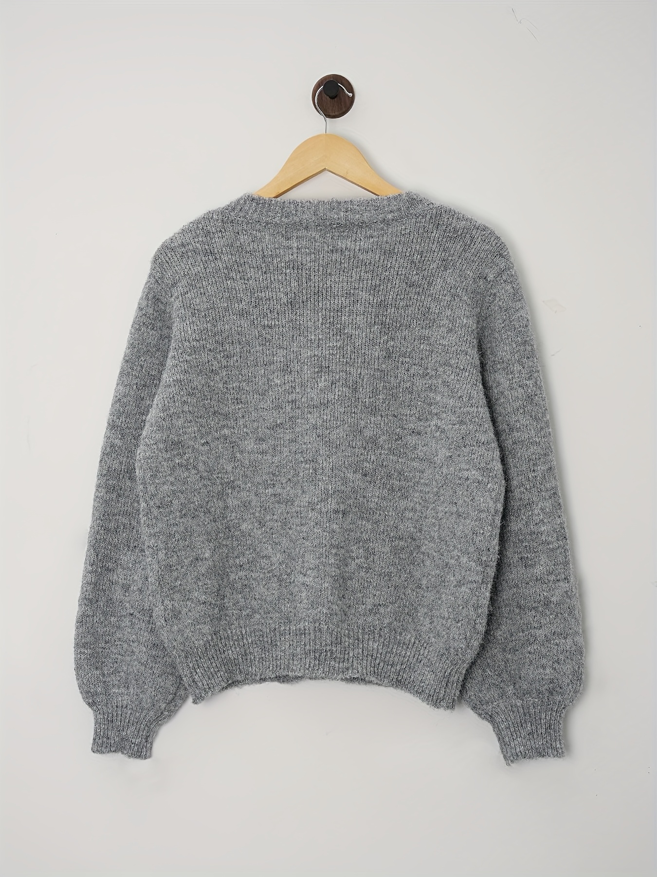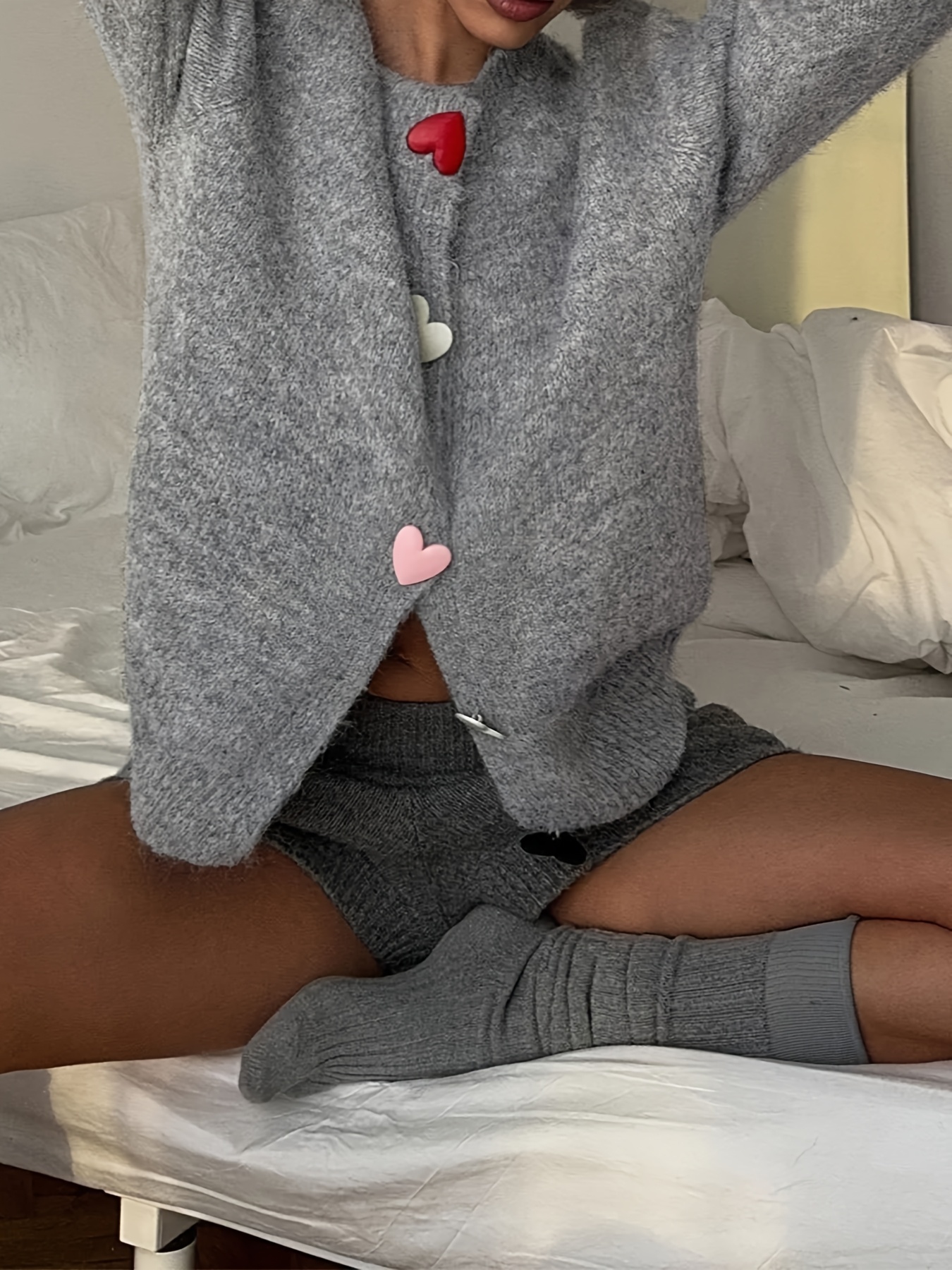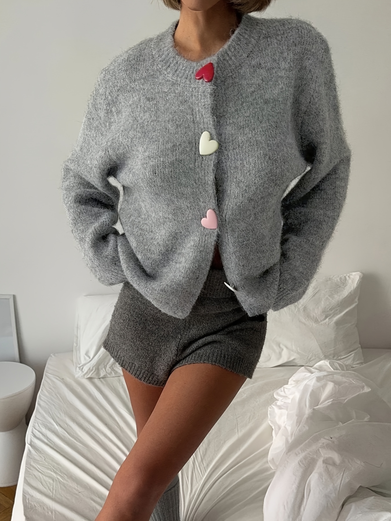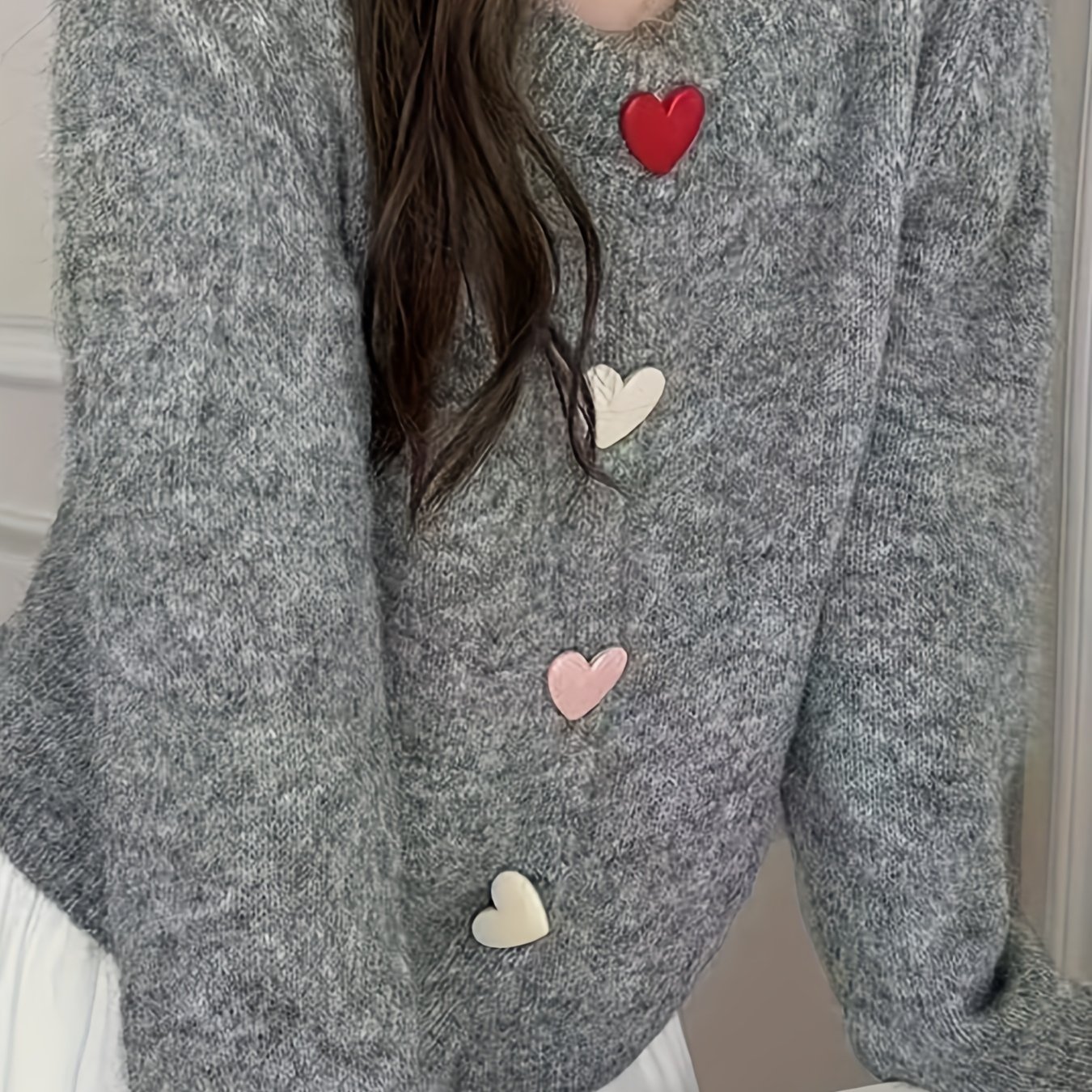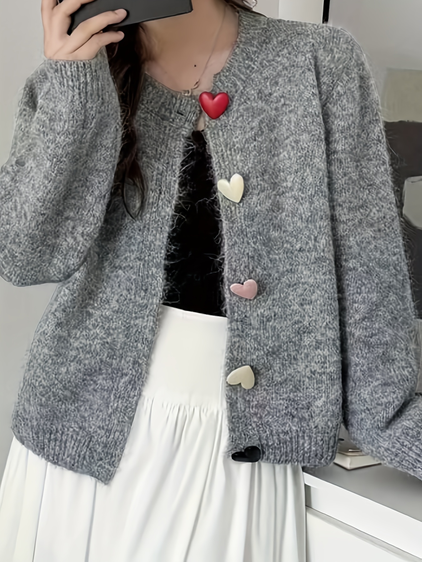 2025 Autumn/Winter New Style Fashionable, Casual, Loose, Versatile Solid – color Round – neck Cardigan Sweater for Women with Heart – shaped Button Design