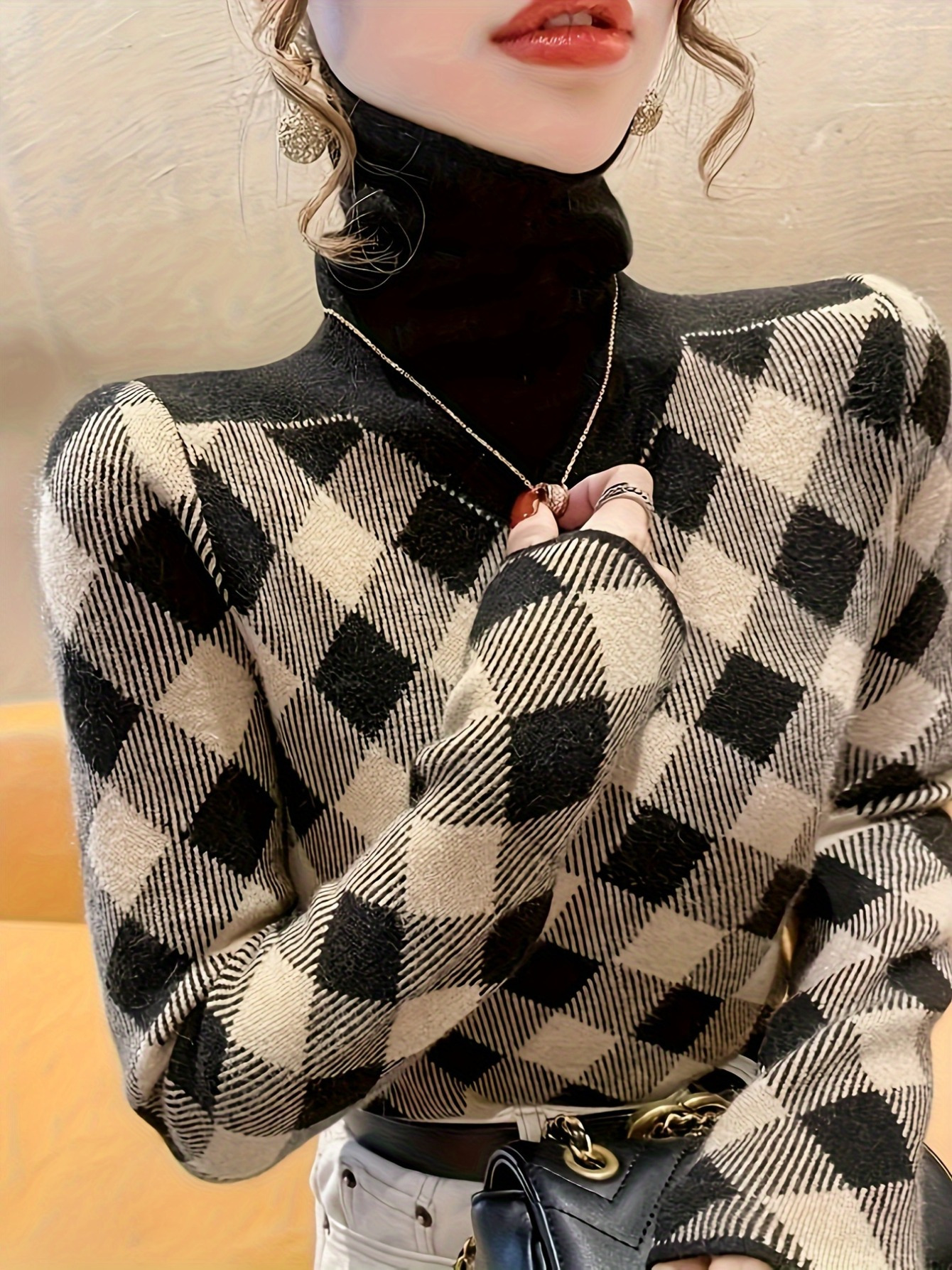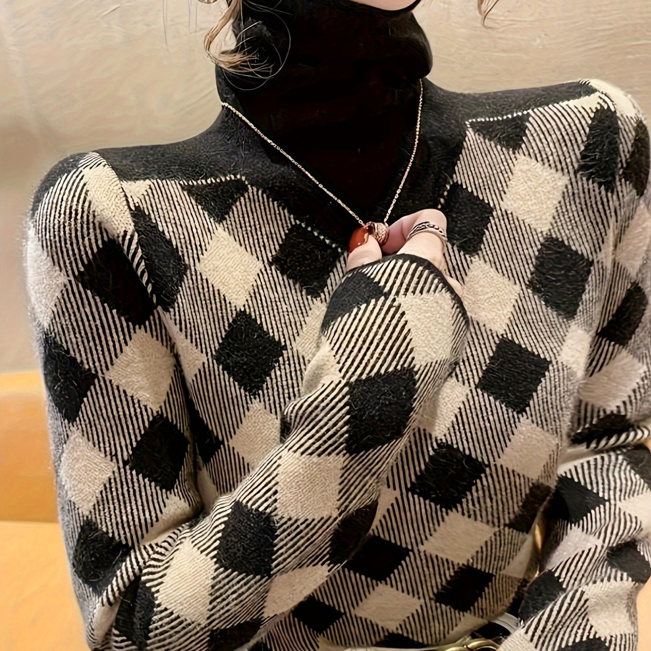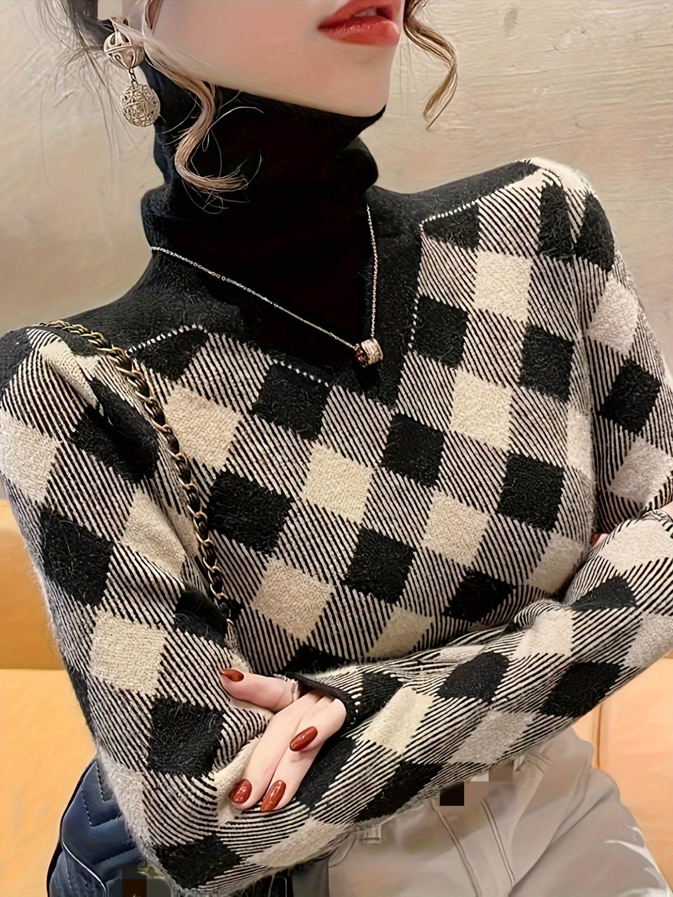 Ladies’ Elegant Black Rice Herringbone Pullover – Turtleneck Sweater for Autumn and Winter. Suitable for office, parties, and daily wear. It’s a machine – washable and stylish knitted sweater, a must – have item in winter. With stretchy fabric and durable material.,